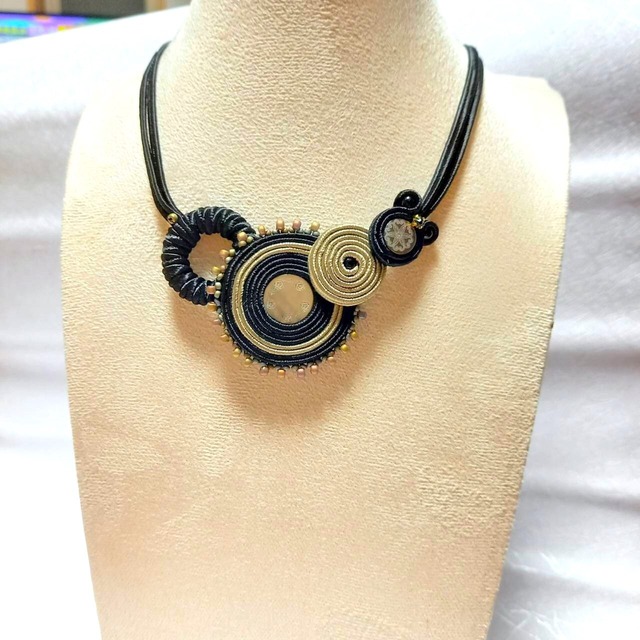 ソウタシエ オリジナルキット シェルビーズのネックレス(中級レベル) 落ち着いたブラックとベージュの組み合わせに、 レーザー彫刻が施されたシェルビーズを中心に据えたデザイン。 天然素材ならではの深みのある色合いと、 一つ一つ異なる表情をお楽しみいただけます。 作り方は、写真をたっぷり使った分かりやすいレシピ付き。 制作中に分からない点があれば、 キット内記載のアドレスよりお気軽にお問い合わせいただけます。 ソウタシエコードは、柔らかく針通りの良い国産コードを使用。 裏用合皮も、厚みと伸縮性にこだわった素材を選んでいます。 同デザインで、 お揃いのピアス/イヤリングもご用意しています。 作り方で分からない点は、 キット内記載のアドレスから お気軽にお問い合わせください。 【キット内容】 写真付きレシピ・材料 【材料】 ・ソウタシエコード ・シェルビーズ ・ガラスビーズ ・ガラスビジュー ・メタルフープ ・金具 ・裏用合皮 【必要な道具】 ・針(きぬえりしめ/ビーズ針) ・糸(ビーズステッチ用) ・はさみ ・ほつれ止め ・布用ボンド ・ペンチ 【出来上がり参考サイズ】 ネックレス:40~46cm ソウタシエコードは 柔らかくて針通りの良い 国産コードを使用。 裏用合皮は厚さも伸縮性も ソウタシエにぴったりの こだわりの合皮を使用。